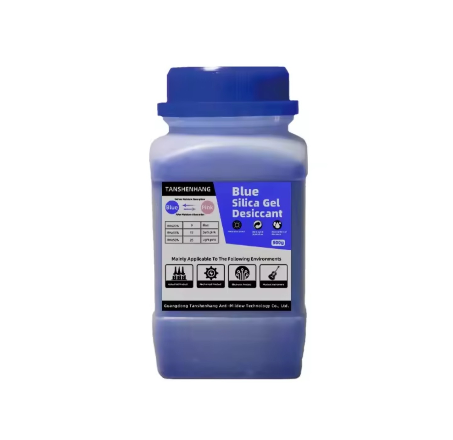 سيليكا جل زرقاء لامتصاص الرطوبة مصممة لحماية المواد الحساسة من التلف الناتج عن الرطوبة مثل لفلمنت للطابعات ثلاثية الأبعاد وغيرها , تتميز بحبيبات تتغير من اللون الأزرق إلى الوردي عند تشبعها بالرطوبة، مما يسهل معرفة وقت استبدالها أو إعادة تنشيطها.